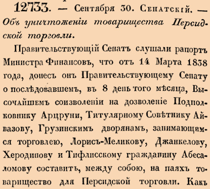 12773. 1839 год. 12 октября (30 сентября ст.ст.) Сенатский. Об уничтожении товарищества Персидской торговли.Правительствующий Сенат слушали рапорт Министра Финансов, что от 14 Марта 1838 года, донес он Правительствующему Сенату о последовавшем, в день 8 того месяца, Высочайшем соизволении на дозволение Подполковнику Арцруни, Титулярному Советнику Айвазову, Грузинским дворянам, занимающимся торговлею, Лорис-Меликову, Джанкелову, Херодинову и Тифлисскому гражданину Абесаломову составить, между собою, на паях товарищество для Персидской торговли <…>