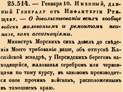 25514. 1814 год. 22 января (10 января ст.ст.) Именный, данный Генералу от Инфантерии Ртищеву.О довольствовании всех вообще войск жалованьем и ремонтом не иначе, как ассигнациями.<…>к сохранению в Государстве золота и серебра, повелеваю употребить по главному Начальству вашему в Грузии меры и особенное попечение, дабы ассигнации Наши имели надлежащий ход; после чего и все без изъятия войска довольствовать жалованьем и ремонтов не иначе, как ассигнациями.