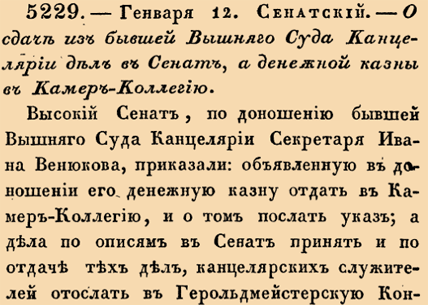 5229. 1728 год. 23 января (12 января ст.ст.) Сенатский. О сдаче из бывшей Вышняго Суда Канцелярии дел в Сенат, а денежной казны в Камер-Коллегию. Высокий Сенат, по доношению бывшей Вышняго Суда Канцелярии Секретаря Ивана Венюкова, приказали: объявленную в доношении его денежную казну отдать в Камер-Коллегию, и о том послан указ; а дела по описям в Сенат принять и по отдаче тех дел, канцелярских служителей отослать в Герольдмейстерскую Контору.