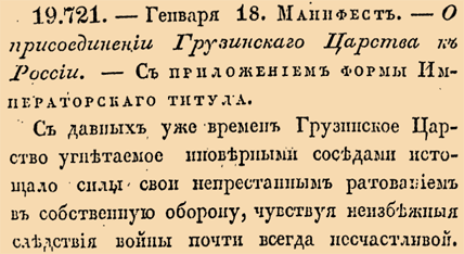 19721. 1801 год. 30 января (18 января ст.ст.) Манифест. О присоединении Грузинскаго Царства к России. С приложением формы Императорскаго титула.<…>Царь Георгий Ираклиевич, видя приближающуюся кончину дне его, знатные чины и сам народ Грузинский прибегли ныне к покрову Нашему, и не предвидя инаго спасения от конечной гибели и покорения врагам их, просили чрез присланных полномочных о принятии областей Грузинскому Царству подвластных в непосредственное подданство Императорскому Всероссийскому престолу.