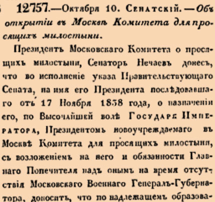 Закон № 112757. — 1839 год 22 октября (10 октября). Об открытии в Москве Комитета для просящих милостыню и официальном объявлении о начале его деятельности.