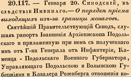 20117. 1802 год. 1 февраля (20 января ст.ст.) Синодский, в следствие Именнаго. О порядке приема выходящих из-за границы монахов.<…>являющихся к находящемуся в Яссах Генеральному Российскому Консулу монахов из природных Российских подданных, объявляющих желание возвратиться в Россию, на основании Всемилостивейшаго Манифеста, состоявшагося в 15 день Марта прошлаго 1801 года, яко Российских подданных, принимая, отсылать к Архиереям с тем, дабы сии удостоверяясь в истине пострижения оных, распределяли их по монастырям