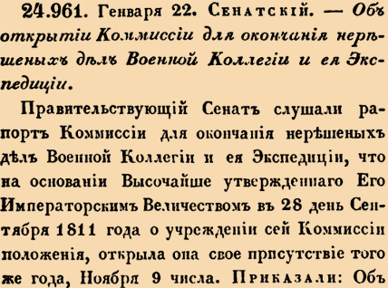 Закон № 24961. 1812 год. 22 января (3 февраля). Указ Правительствующего Сената об уведомлении государственных органов касательно начала работы Комиссии для окончания нерешенных дел упраздненной Военной коллегии.