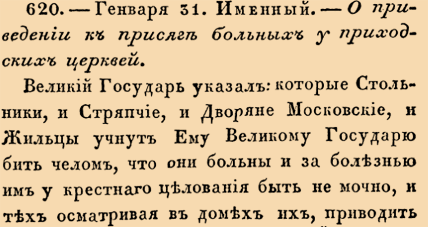Закон № 620. 1676 год. 31 января (10 февраля). Указ о порядке освидетельствования и приведения к присяге больных придворных чинов в приходских церквях по месту жительства.
