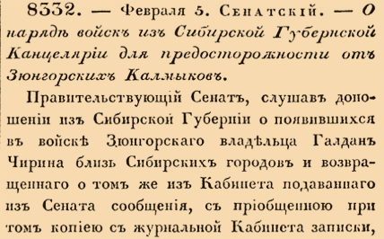 8332. 1741 год 16 февраля (5 февраля ст.ст.). Сенатский. О наряде войск из Сибирской Губернской Канцелярии для предосторожности от Зюнгорских Калмыков<…>для надлежащей от оных Калмыков предосторожности в те места, близ которых оные Калмыки имеются, нарядить и отправить из Сибирской Губернской Канцелярии, собрав из городов той Губернии регулярных и нерегулярных людей, сколько надлежит, а в случае нужды употребить из тамошних обывателей, и смотреть того накрепко <...>