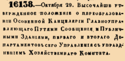 Закон № 16138. — 1842 год 29 октября (10 ноября). Указ о реорганизации Главного управления путей сообщения и публичных зданий путем разделения департаментов по функциональному признаку.