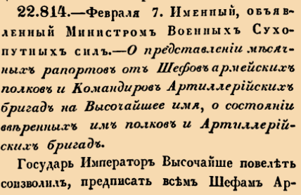 22814. 1808 год. 19 февраля (7 февраля ст.ст.). Именный, объявленный Министром Военных Сухопутных сил. О представлении месячных рапортов от Шефов армейских полков и Командиров Артиллерийских бригад на Высочайшее имя, о состоянии вверенных им полков и Артиллерийских бригад <…> Доставляемые на Высочайшее имя Его Императорскаго Величества, о состоянии вверенных им полков и Артиллерийских бригад, месячные рапорты отправлять всегда по истечении каждаго месяца 1-го наступающаго числа, а не в другое какое время, как некоторые доставляют оные от разных чисел…