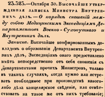 Закон № 23.323 — 1809 год 30 октября (11 ноября). Закон об упорядочивании порядка сношений между медицинскими экспедициями Военного ведомства и Министерства внутренних дел.