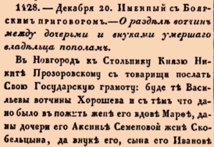 1428. 1691 год. 30 декабря (20 декабря ст.ст.) Именный с Боярским приговором. О разделе вотчин между дочерьми и внуками умершаго владельца пополам. В Новгород к Стольнику Князю Никите Прозоровскому с товарищи послать Свою Государскую грамоту: буде те Васильевы вотчины Хорошева и с тем что дано было в пожить жене его вдове Марфе, даны дочери его Аксинье Семеновой жене Скобельцына, да внуке его, сына его Иванове дочери Хорошева, девке Евфимье пополам