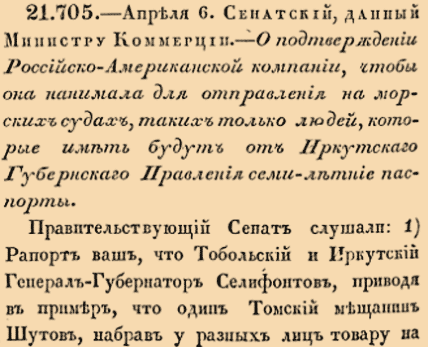 21705. 1805 год. 18 апреля (6 апреля ст.ст.). Сенатский, данный Министру Коммерции.О подтверждении Российско-Американской компании, чтобы она нанимала для отправления на морских судах, таких только людей, которые иметь будут от Иркутскаго Губернскаго Правления семилетние паспорты <…>