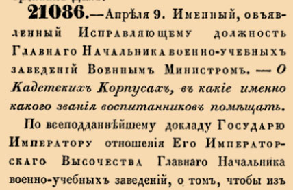 21086. 1847 год. 9 апреля (21 апреля). Именный, объявленный Исправляющему должность Главнаго Начальника военно-учебных заведений Военным Министром. О Кадетских Корпусах, в какие именно какого звания воспитанников помещать.