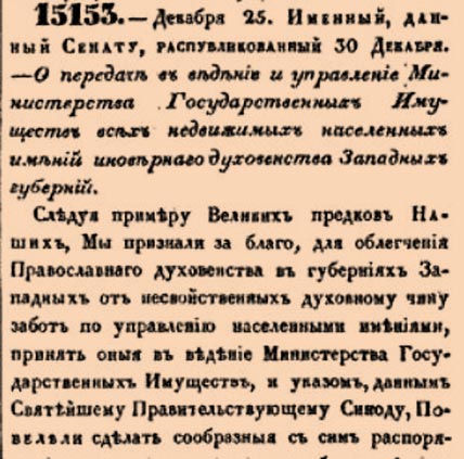 Закон № 15153. 1841 год. 25 декабря (6 января 1842 года). Указ о секуляризации населенных имений иноверного духовенства в Западных губерниях и передаче их в казну.