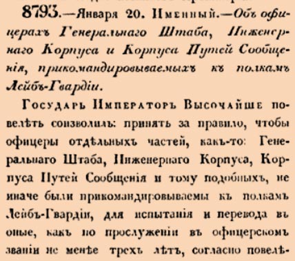 8793. 1836 год. 1 февраля (20 января ст.ст.) Именный. Об офицерах Генеральнаго Штаба, Инженернаго Корпуса и Корпуса Путей Сообщения, прикомандировываемых к полкам Лейб-Гвардии.Государь Император Высочайше повелеть соизволил: принять за правило, чтобы офицеры отдельных частей, как-то: Генеральнаго Штаба, Инженернаго Корпуса, Корпуса Путей Сообщения и тому подобных, не иначе были прикомандировываемы к полкам Лейб-Гвардии, для испытания и перевода в оные, как по прослужении в офицерском звании не менее трех лет <…>