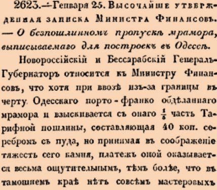 2623. 1829 год. 6 февраля (25 января ст.ст.) Высочайше утвержденная записка Министра Финансов. О беспошлинном пропуске мрамора, выписываемаго для построек в Одессе.Новороссийский и Бессарабский Генерал-Губернатор относится к Министру Финансов, что хотя при ввозе из-за границы в черту Одесскаго порто-франко обделаннаго мрамора и взыскивается с онаго 1/3 часть тарифной пошлины, составляющая 40 коп. серебром с пуда, но принимая в соображение тяжесть сего камня, платеж оной оказывается весьма ощутительным <…>