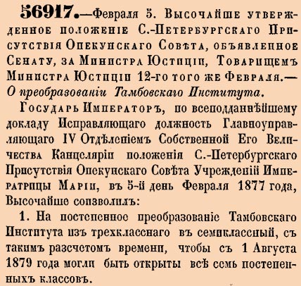 56917. 1877 год. 17 февраля (5 февраля ст.ст.) Высочайше утвержденное положение С.-Петербургскаго Присутствия Опекунскаго Совета, объявлено Сенату, за Министра Юстиции, Товарищем Министра Юстиции 12-го того же Февраля. – О преобразовании Тамбовскаго Института.Государь Император, по всеподданнейшему докладу Исправляющаго должность Главноуправляющаго IV Отделением Собственной Его Величества Канцелярии положения С.-Петербургскаго Присутствия Опекунскаго Совета Учреждений Императрицы Марии, в 5-й день Февраля 1877 года, Высочайше повелеть соизволил...