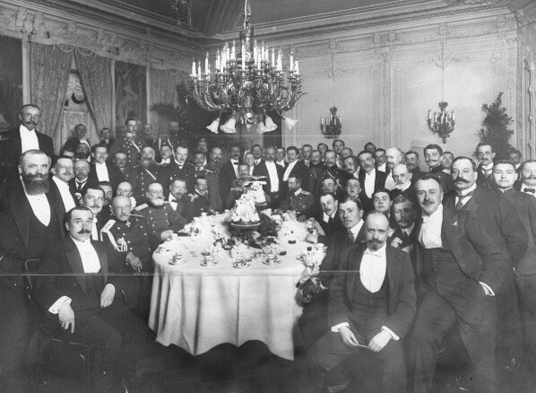 Группа авиаторов за праздничным столом по случаю открытия авиационных состязаний на Первом Всероссийском празднике воздухоплавания на Комендантском аэродроме