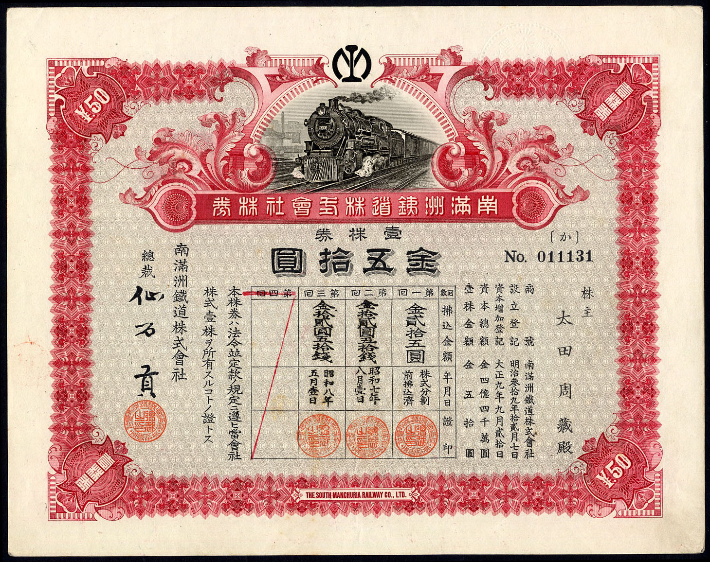 Акция South Manchuria Railway Company Ltd. 50 йен