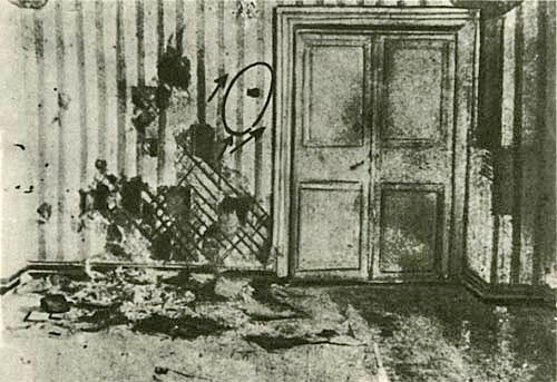 На фотографии очерчено и указано стрелками место, где следователь Соколов обнаружил на обоях брызги крови, не смытые убийцами