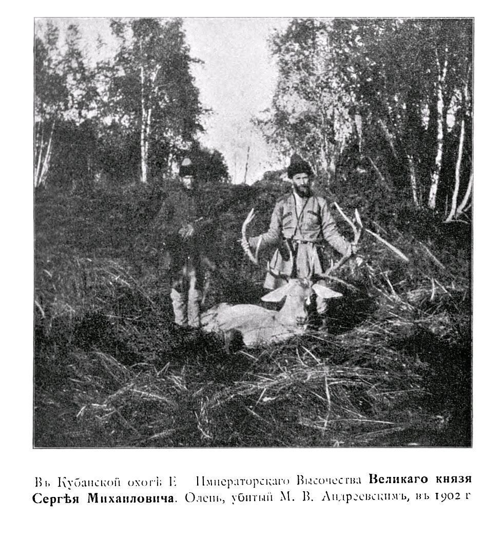 В Кубанской охоте Его Императорского Высочества Великого Князя Сергея Михайловича. Олень, убитый М.В. Андреевским в 1902 году.