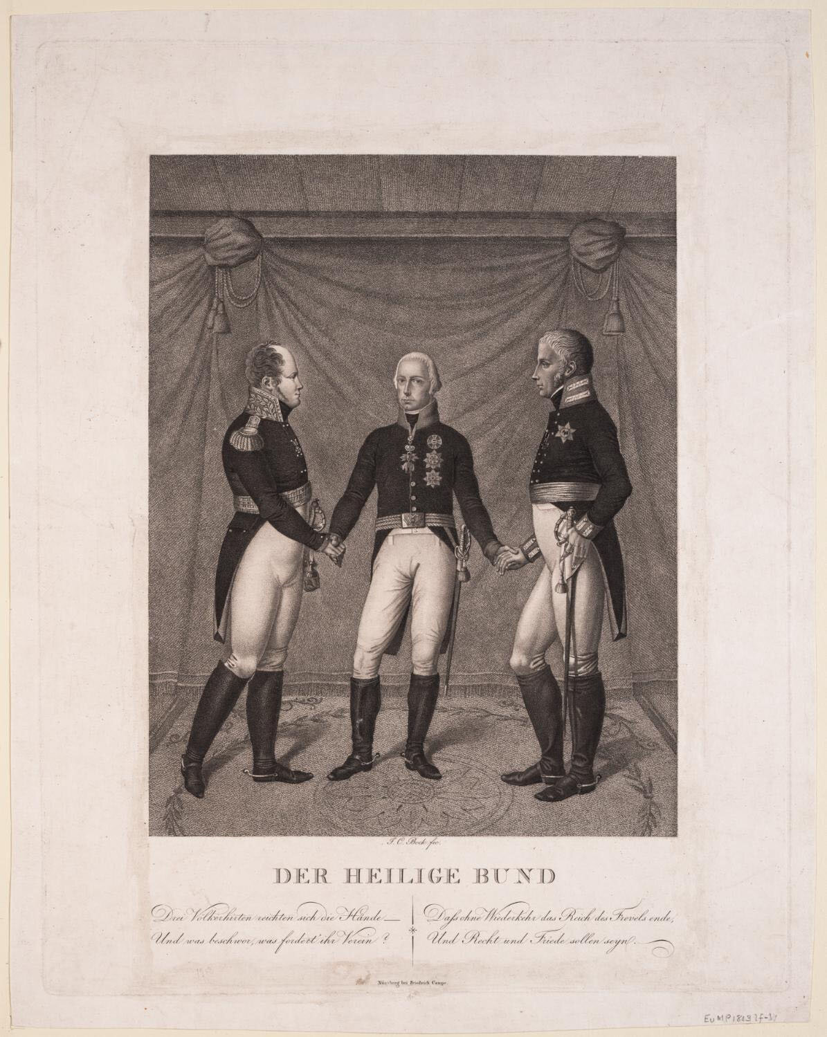 Надпись на гравюре: DER HEILIGE BUND. Drei Völkerhirten reichten sich die Hände Und was beschwor, was fordert' ihr Verein? Dass ohne Wiederkehr das Reich des Frevels ende, Und Recht und Friede solen seyn.