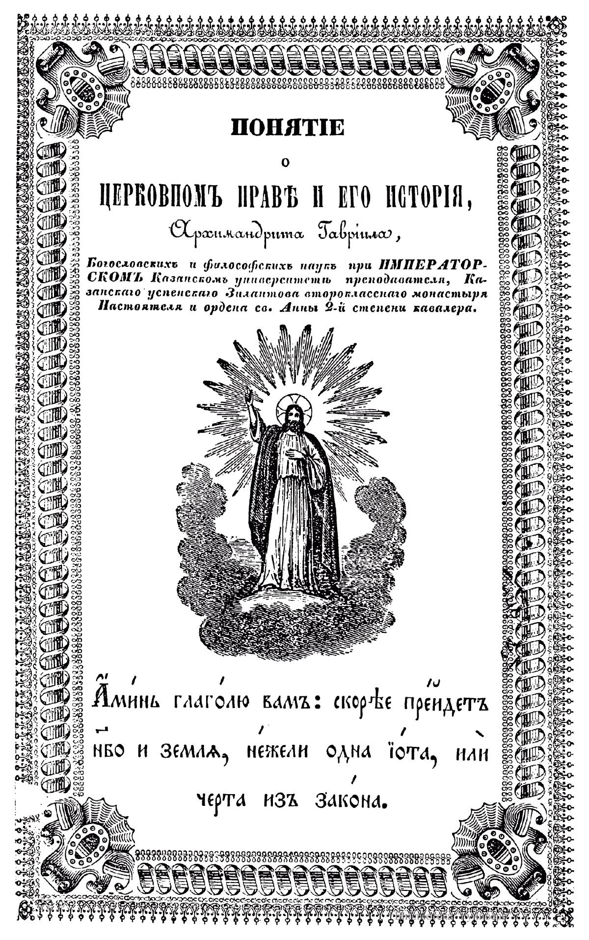 Титульный лист издания: Гавриил, архимандрит (Василий Николаевич Воскресенский). Понятие о церковном праве и его история, Архимандрита Гавриила. — Казань. 1844.