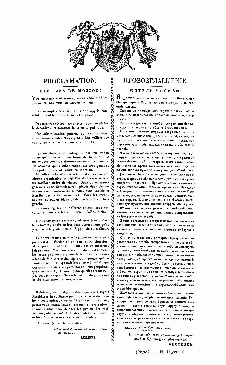 Жители Москвы! Несчастья ваши жестоки, но Его Величество Император и Король желает прекратить течение оных.