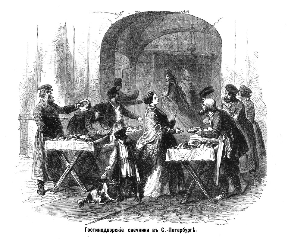 Продавцы саек приподнимают свои шапки, почтительно кланяются вам, указывая на свой товар — точь в точь как изображено на прилагаемом при сем рисунке — и наперерыв друг перед другом приманивают вас к своему столу. Они так усердно упрашивают вас, так расхваливают свой товар (причем очень часто бросают не совсем-то выгодную тень на товар своего соседа), что право надо иметь каменное сердце, или уж слишком мало свободного времени, чтобы не купить у них сайки или кренделя. Мягкие, горячие сайки не всегда оказываются такими, по крайней мере, они далеко не так хороши, как уверяют их продавцы, — но что нужды! Посмотрите, какие славные, чисто русские физиономии! Добродушные и вместе с тем смышленые глаза, русые бороды, и этот костюм!.. Нет, как хотите, «тут русский дух, тут Русью пахнет!..»
