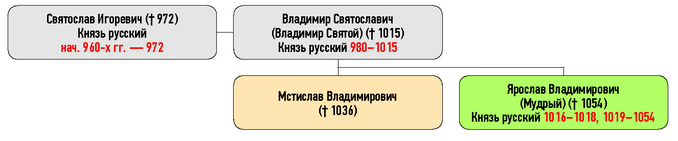Святослав Игоревич († 972) Князь русский, Владимир Святославич (Владимир Святой) († 1015), Ярослав Владимирович (Мудрый) († 1054), Мстислав Владимирович († 1036)