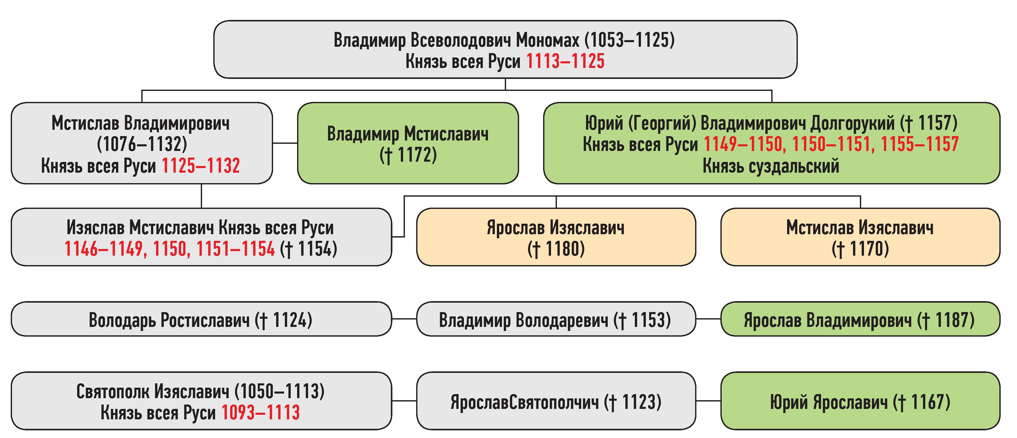 Юрий Владимирович — сын Владимира Всеволодовича Мономаха, Ярослав Владимирович — сын Владимира Володаревича, Владимир Мстиславич — сын Мстислава Владимировича, Юрий Ярославич — сын Ярослава Святополчича, Мстислав, Ярослав Изяславичи — сыновья Изяслава Мстиславича