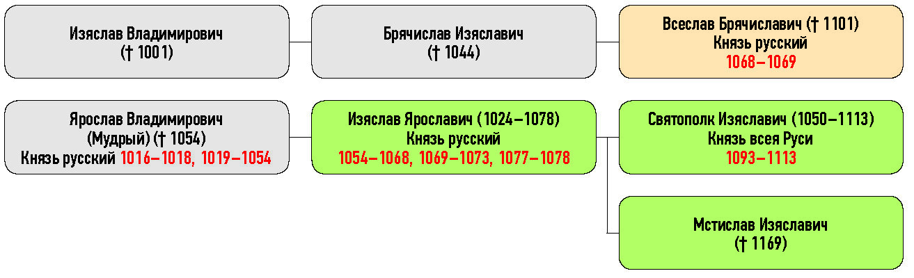 Изяслав Владимирович († 1001), Брячислав Изяславич († 1044), Всеслав Брячиславич († 1101) Князь русский, Ярослав Владимирович (Мудрый) († 1054), Изяслав Ярославич (1024–1078) Князь русский, Святополк Изяславич (1050–1113) Князь всея Руси, Мстислав Изяславич († 1169)