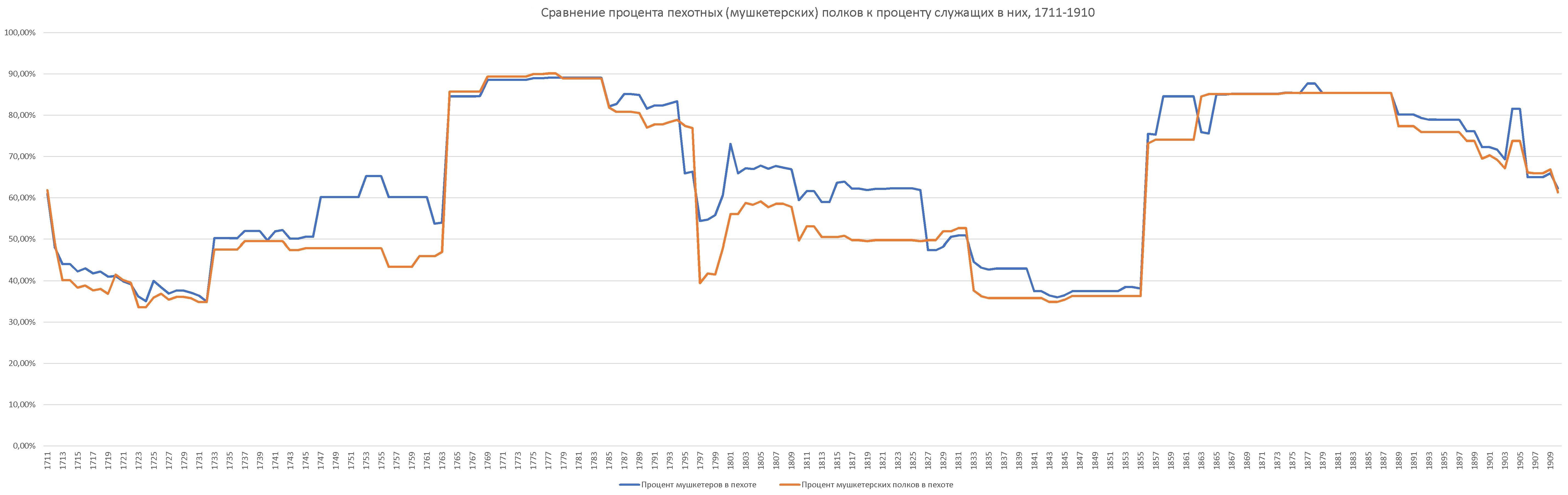 Сравнение процента пехотных полков к проценту служащих в пехоте русской армии
