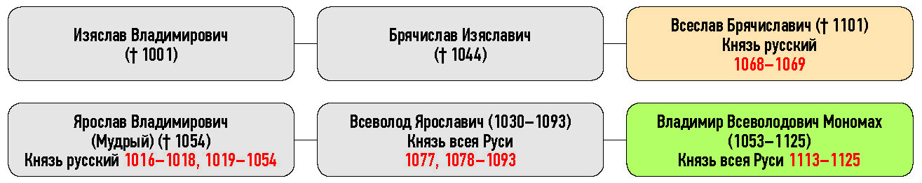 Изяслав Владимирович († 1001), Брячислав Изяславич († 1044), Всеслав Брячиславич († 1101) Князь русский, Ярослав Владимирович (Мудрый) († 1054), Всеволод Ярославич (1030–1093) Князь всея Руси, Владимир Всеволодович Мономах (1053–1125)