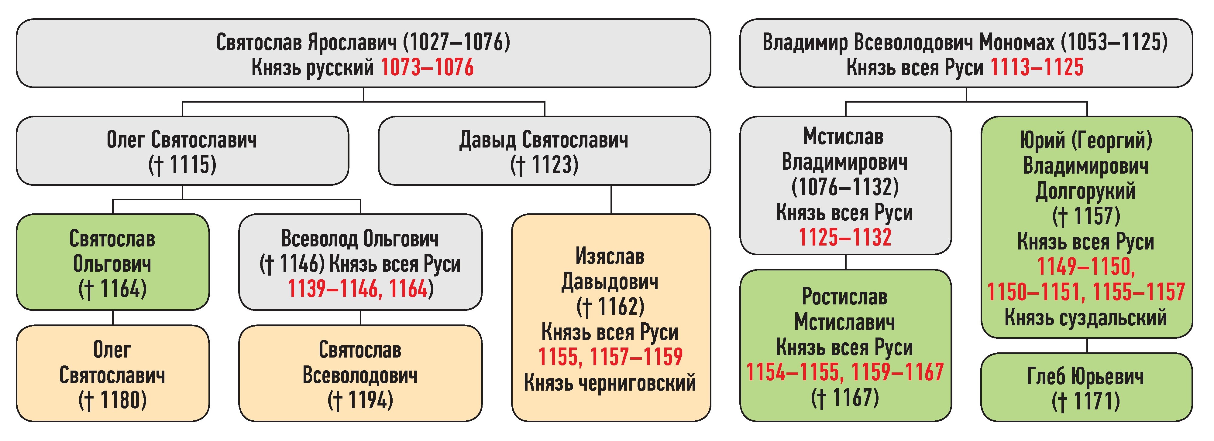 Изяслав Давыдович — сын Давыда Святославича, Святослав Всеволодович — сын Всеволода Ольговича, Олег Святославич — сын Святослава Ольговича, Ростислав Мстиславич — сын Мстислава Владимировича, Святослав Ольгович — сын Олега Святославича, Глеб Юрьевич — сын Юрия Владимировича