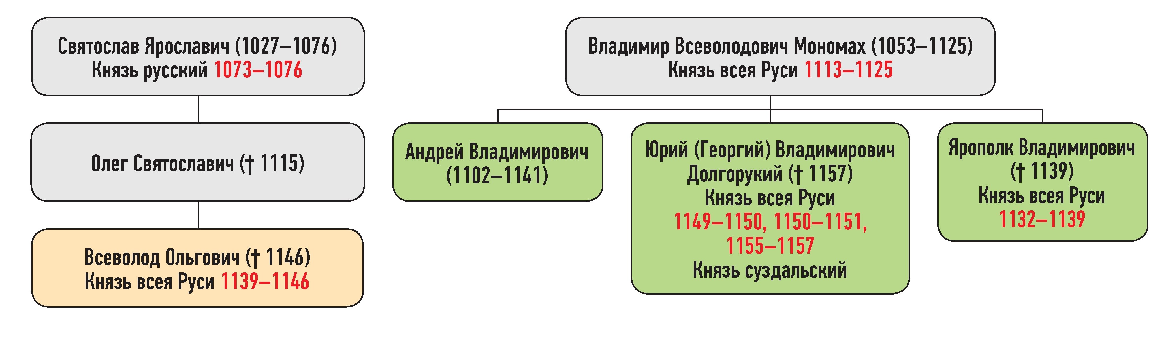 Ярополк, Андрей, Юрий Владимирович — сыновья Владимира Всеволодовича Мономаха, Всеволод Ольгович — сын Олега Святославича