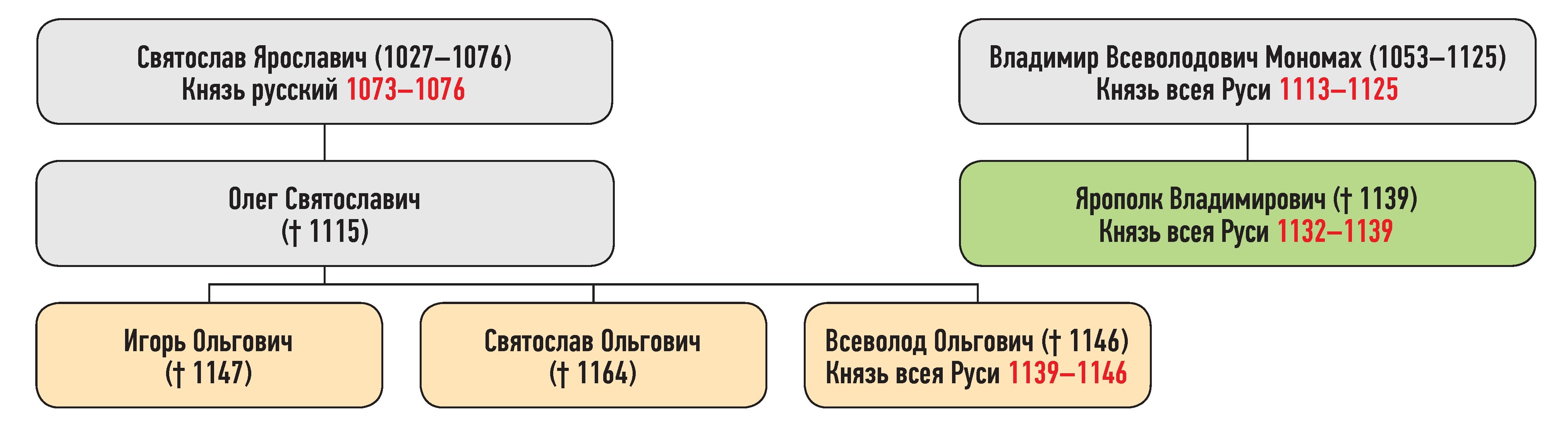 Всеволод, Святослав и Игорь Ольговичи — сыновья Олега Святославича, Ярополк Владимирович — сын Владимира Всеволодовича Мономаха