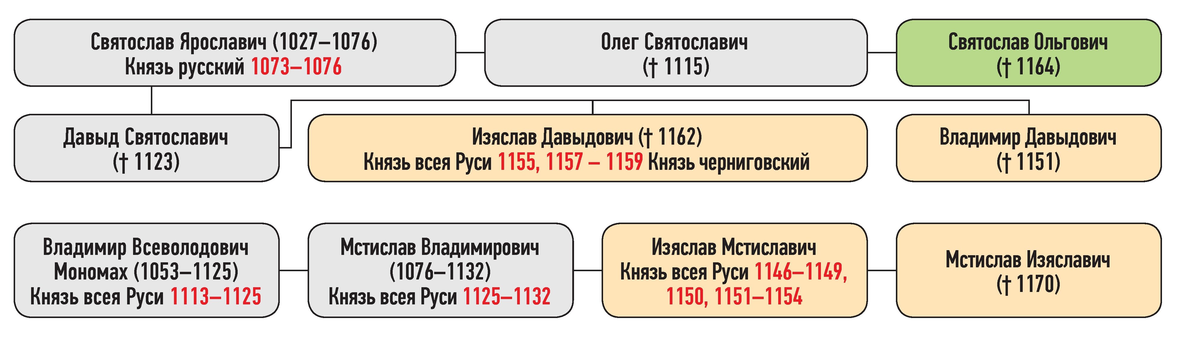 Мстислав Изяславич — сын Изяслава Мстиславича, Изяслав, Владимир Давыдовичи — сыновья Давыда Святославича, Святослав Ольгович — сын Олега Святославича