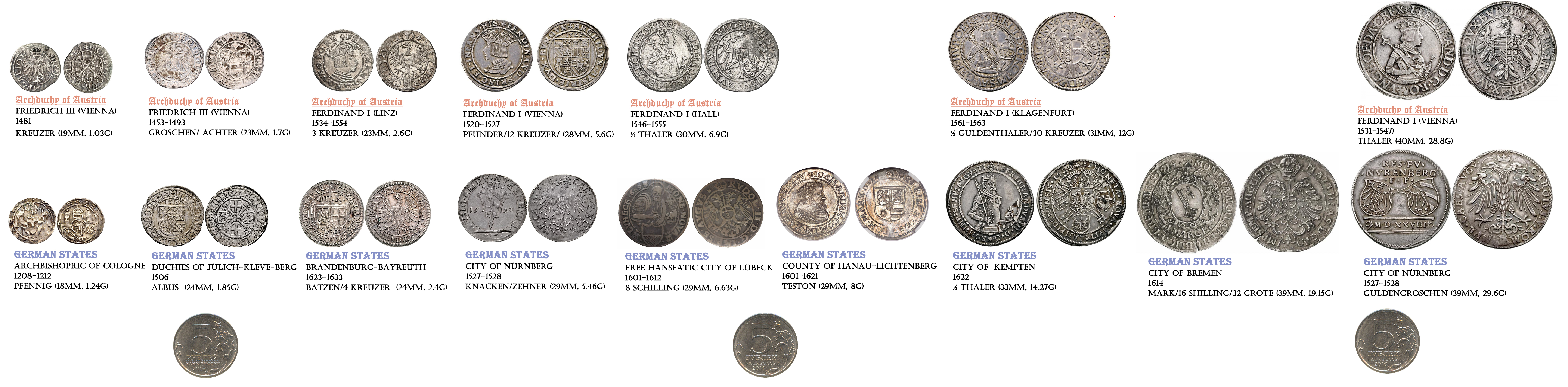 Усредненный набор типичных монет 1200-1500 гг. на примере Австрии и Германии, упорядоченный по размеру от крейцера до талера