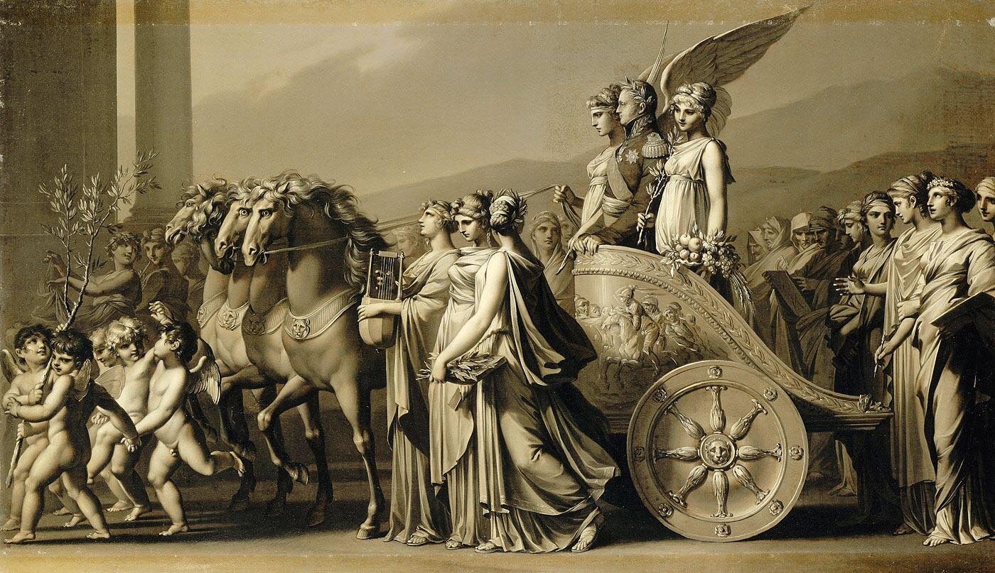 Произведение копирует рисунок Пьера Поля Прюдона ((фр. Prud’hon, Pierre Paul 1758—1823) прославляющий Наполеона Бонапарта, который выставлялся на Парижском Салоне 1801 года под названием «Аллегория мира». Буальи в 1814 скопировал эту композицию, использовав технику гризайли. При этом фигуру Наполеона он заменил изображением Александра I.