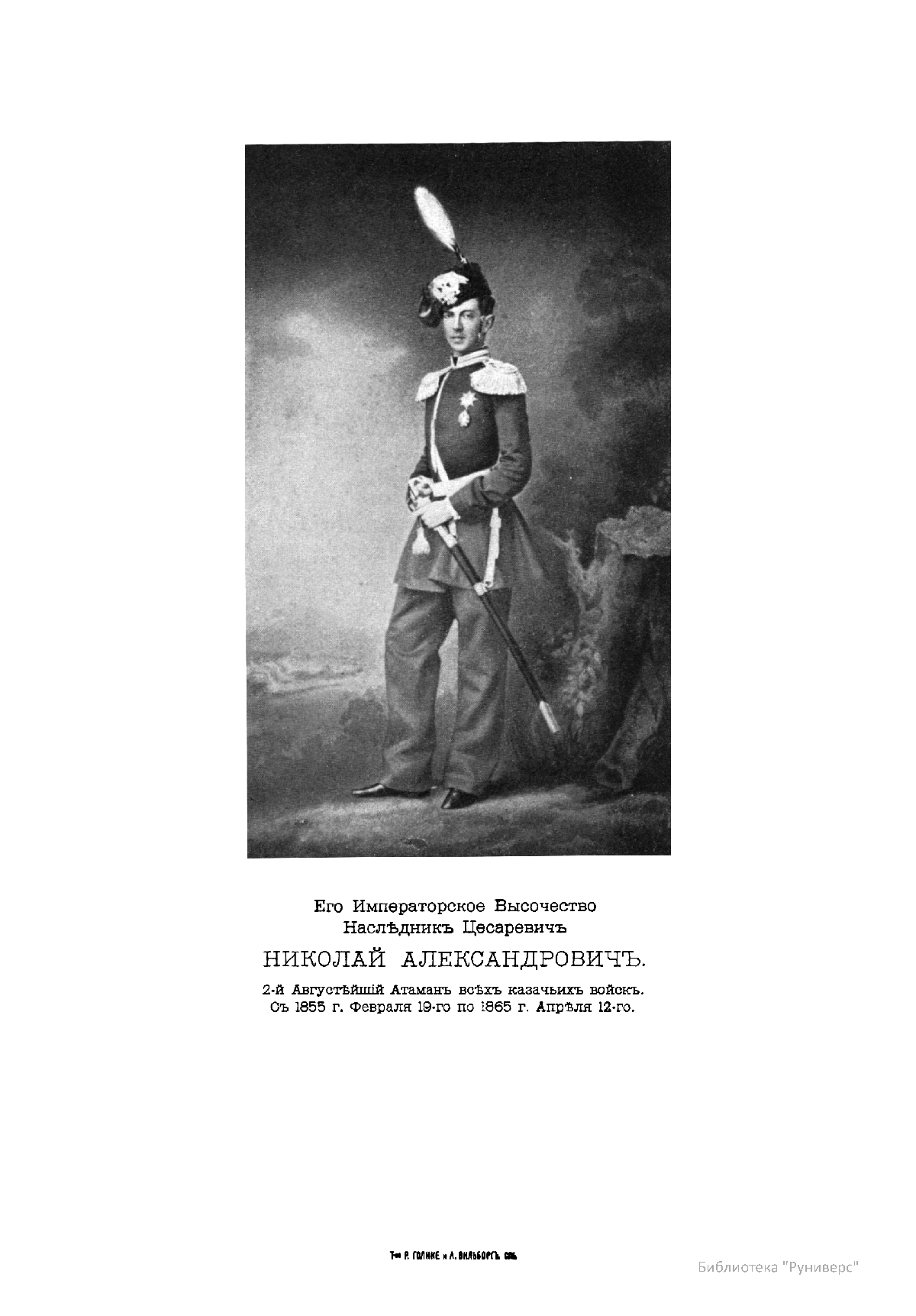 Его Императорское Высочество Наследник Цесаревич Николай Александрович. 2-й Августейший Атаман всех казачьих войск. С 1855 г. Февраля 19-го по 1865 г. Апреля 12-го.