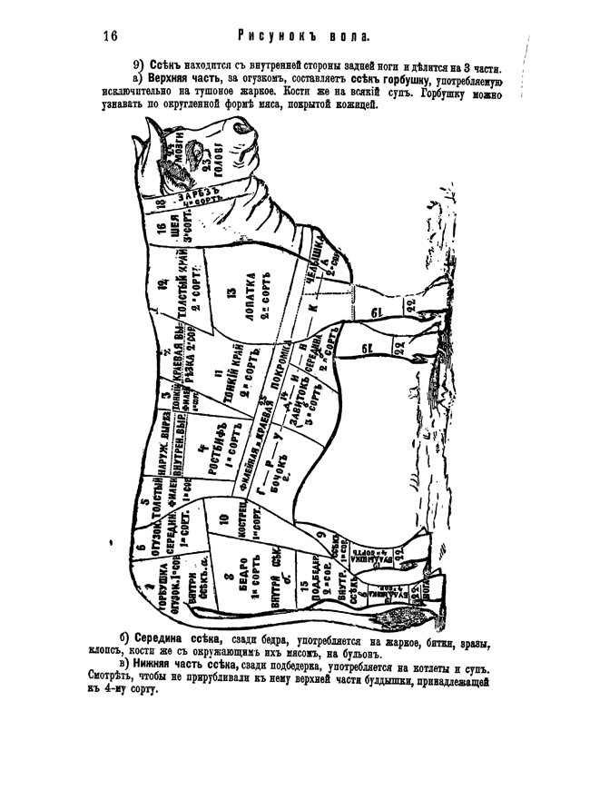 Рисунок и разбор вола, качество мяса и его сорт.