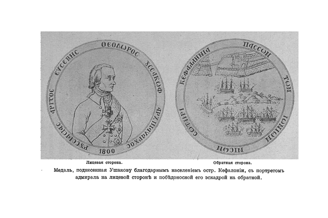 Медаль, поднесенная Ушакову благодарным населением острова Кефалонии, с портретом адмирала Ушакова на лицевой стороне и победоносной его эскадры на обратной.