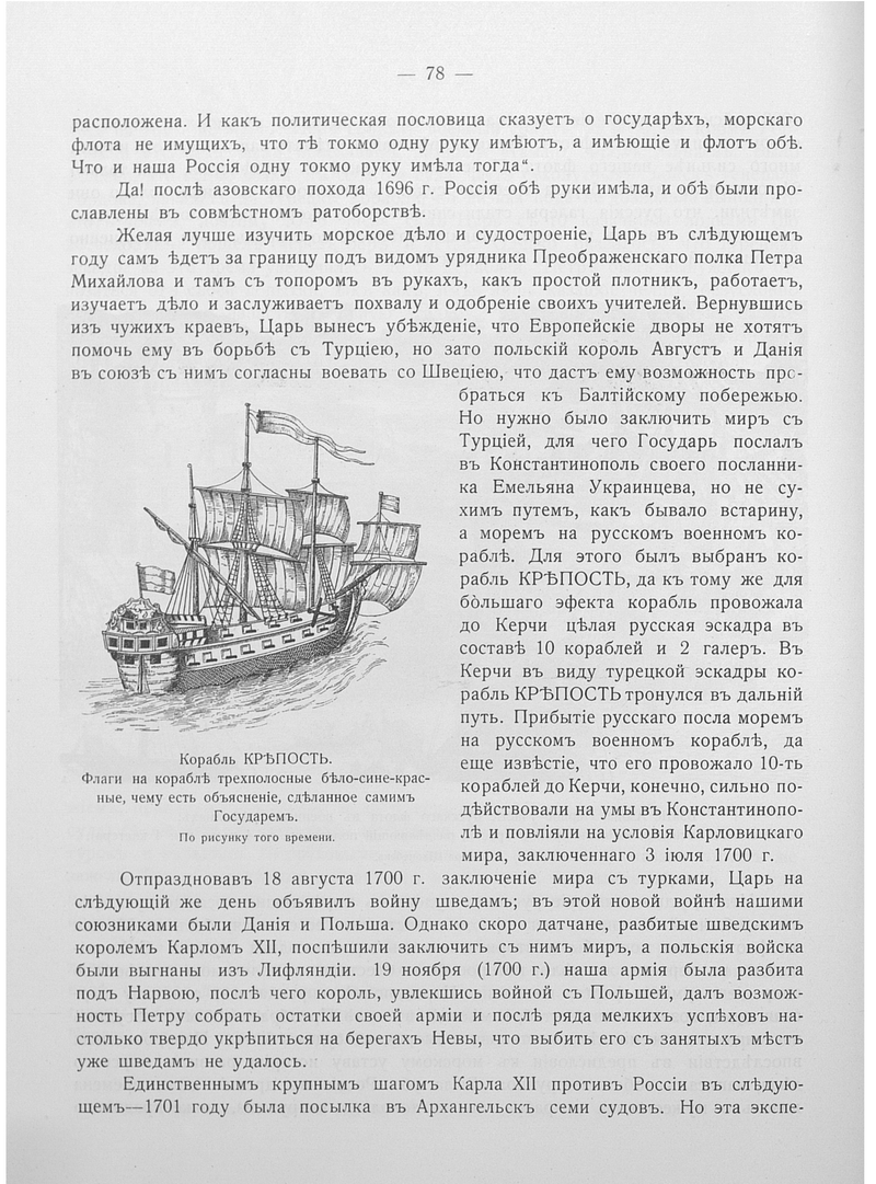 Корабль КРЕПОСТЬ. Флаги на корабле трехполосные бело-сине-красные, чему есть объяснение, сделанное самим Государем.
