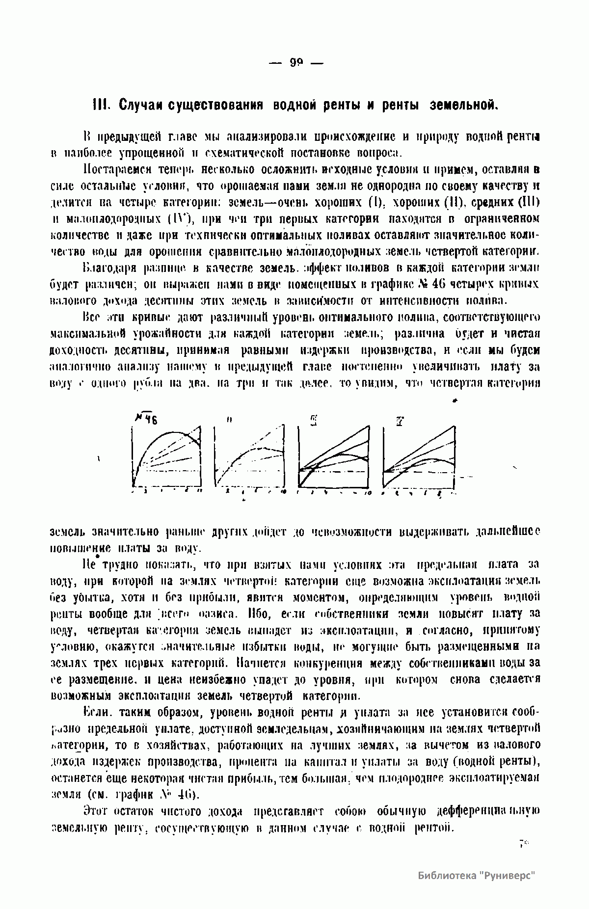 №46. Кривые валового дохода десятины земель - (I) очень хороших, (II) хороших, (III) средних, (IV) малоплодородных в зависимости от интенсивности полива.