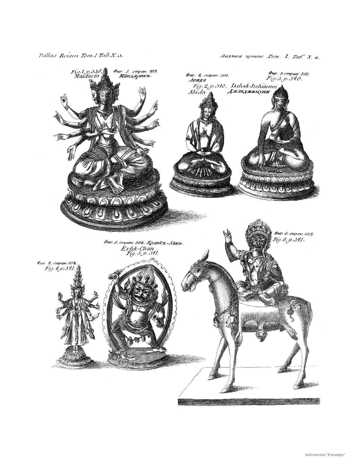 Том I. Таб.X. А. Фиг.1.Мандарин. Фиг.2.Абида. Фиг.3.Джакджимуни. Фиг.5.Ерлик-Хан. Фиг.6.стр.502