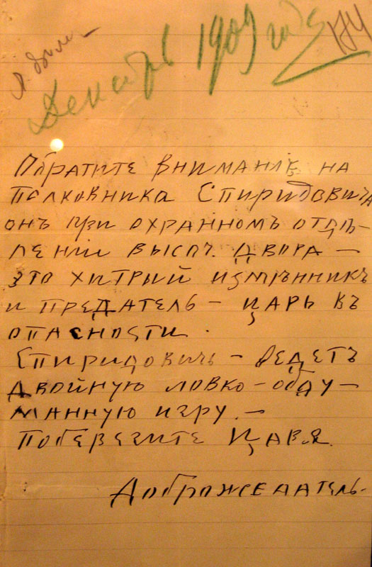 Анонимное письмо с подписью "Доброжелатель" с призывом обратить внимание на полковника Спиридовича. Декабрь 1909 г.
