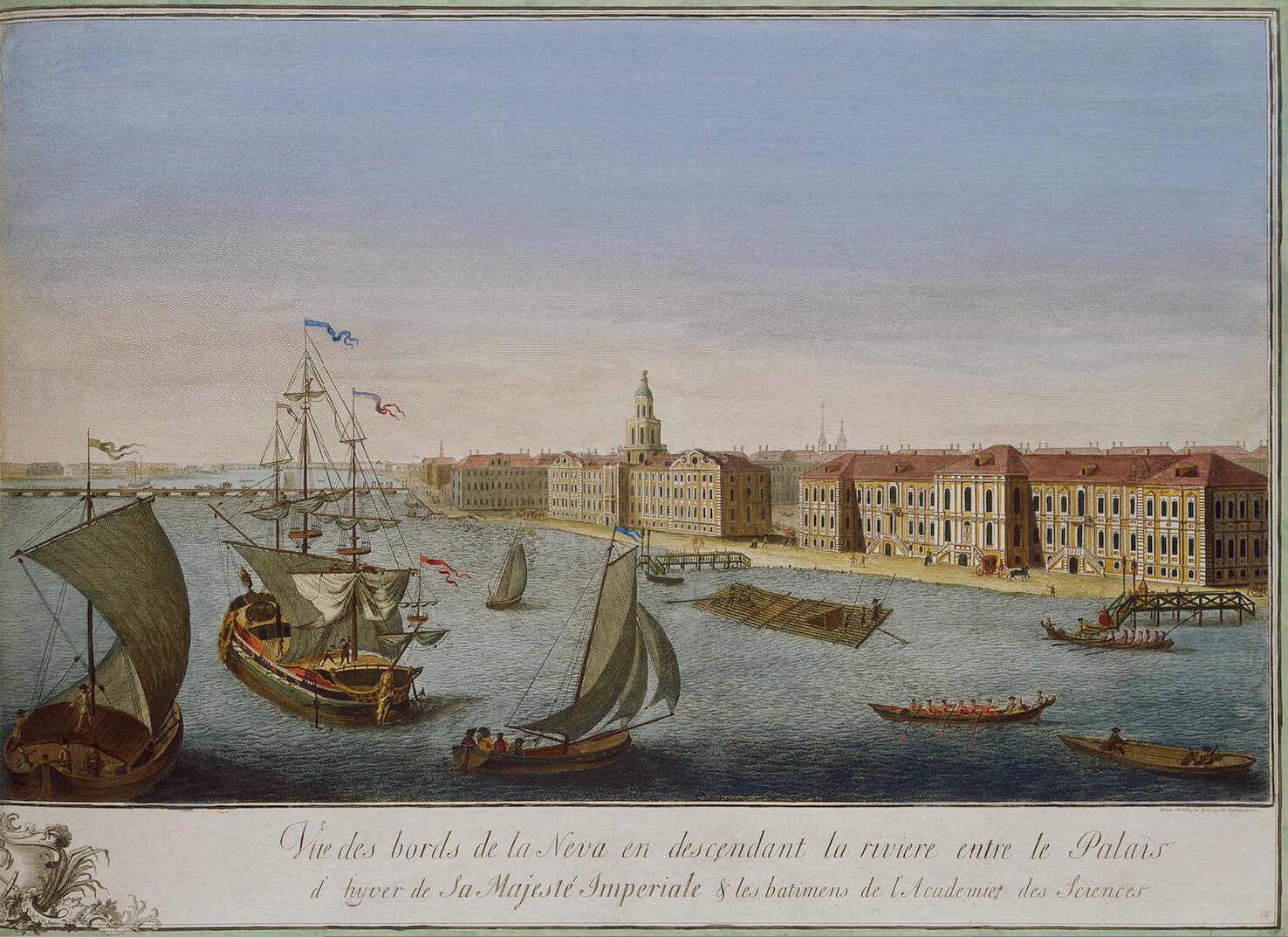 Проспект вниз по Неве-реке между Зимним дворцом и Академией наук. Гравюра Г. А. Качалова и Е. Г. Виноградова по рисунку М. И. Махаева. 1753 год