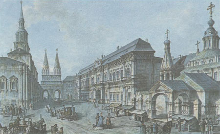 Здание Московского Университета у Воскресенских ворот на Красной площади. Гравюра начала XIX века.