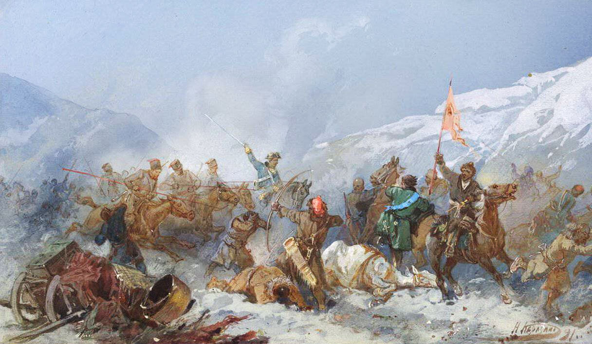 Лист из серии акварелей, входящих в альбом «Картины из истории службы Сибирского казачьего войска». Альбом был преподнесен императору Николаю II – «Августейшему Атаману» – в 1891 г. во время его поездки по Сибири.