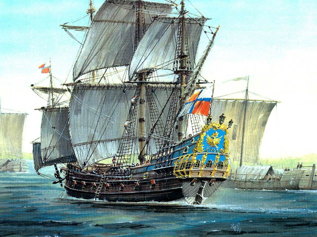 Извещая Государя, что 14-го Ноября заложен корабль, Полуехтов доносил: «конатных и бичевных мастеров Коломенскаго епископа села Городища крестьян без указу великаго государя взять не смеют, а из воли те мастеры не подряжаютца, и опричь тех мастеров на Коломне нет; паруснаго мастера нет; надобно на карабле вырезать каруна (корону), и что де на той каруне вырезать и кому резать? а Немцы которые карабль делают, резать той каруны не умеют; да надобно на карабль и на яхту с семьсот векшей деревянных, а мастер де тех векшей живет на Протве; Марселис прислал железа только тридцать девять пуд, а под то железо подвод не дал, а в котлах, и в горшках, и в векшах, и в подъемах, и в якорях отказал, посылать под то железо не на чем и якорей ковать (в Дединове) негде: кузницы и горны малые; подъемы надобно скоро, а купить негде.