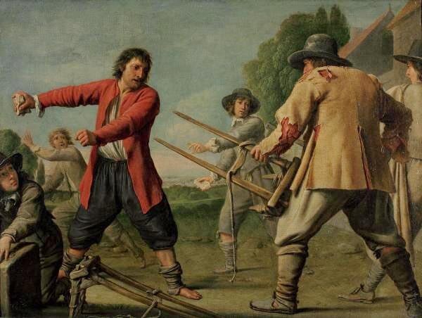 Как сошлись они вместе, один ударил его палкою, против чего и тот, ухватя его за волосы, ударил об землю и, отняв у него палку, оною бил его…